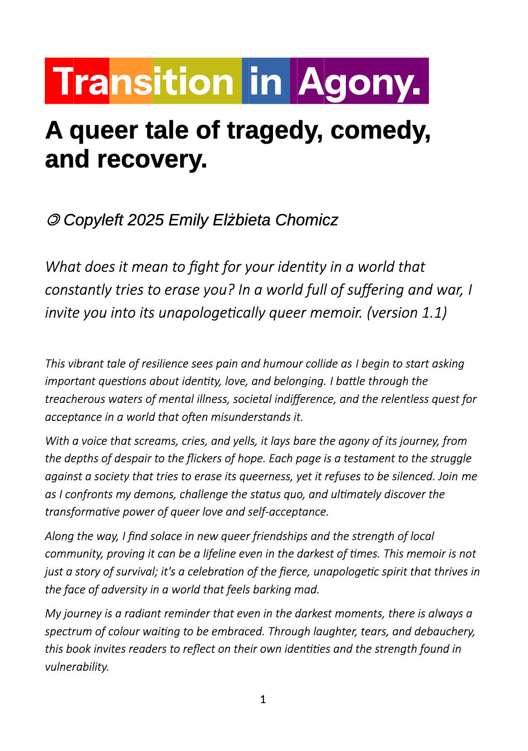 My name is Emily Elżbieta Chomicz, an investigative reporter for Queer Love Riot, author, trans rights activist, mental health worker, and IT professional.I fought the the British and Polish government for six years to be legally recognised as Emily, using my own legal arguments paving the way for other trans people.I expose our broken systems in the UK are in a play-by-play in poetry, creative writing, and a heavy dose of irony, humour and sarcasm to illustrate my points.Transition in Agony is a story about the rising fascist threat and what we can do to keep ourselves safe. I look for hope in a sea of desperation, and reasons behind my decisions to start Queer Love Riot as a news outlet.If you have any questions about this book or you spot an error, please contact me. Thank you for reading, it's my pleasure to serve the public interest.Emily Elzbieta Chomicz
